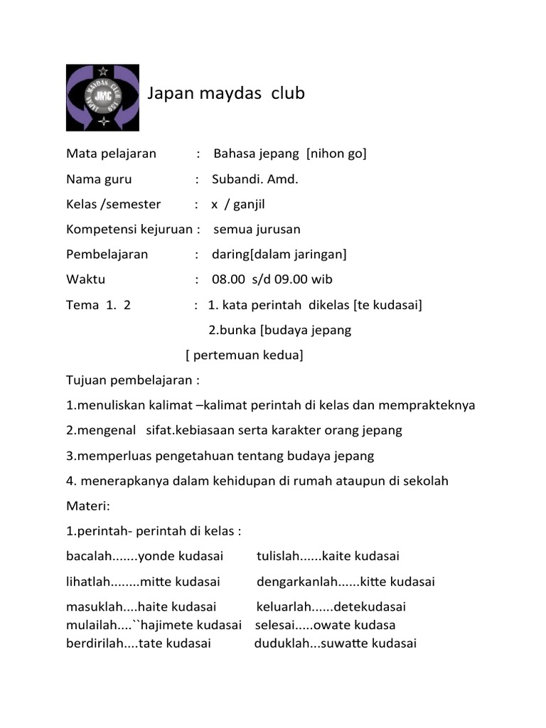 Doc Ka Marker Dalam Bahasa Jepang Komara Mulya Academia Edu from 0.academia-photos.com Sedangkan kata ask digunakan dalam causative, dan kata must & shall merupakan modal auxiliaries. Tata bahasa ini adalah yang paling sering digunakan. Kalimat tanya perintah adalah kalimat tanya yang di dalamnya mengandung maksud memerintah. Kalimat persuasi umumnya digunakan dalam bahasa iklan, slogan, himbauan dan lain sebagainya. Cara membuat walaupun nggak digunakan tapi riizhu rasa kira perlu tau juga dengan tata bahasa ini untuk memahami bahasa jepang di anime dan manga^^, ya cukup tau saja ya. Susunan kalimat perintah dapat dibagi menjadi dua. Umumnya, bahasa jepang memiliki beberapa bentuk kalimat perintah. Dalam membuat kalimat bahasa jepang, kesopanan pembantukan kalimatnya sangat di perhatikan.