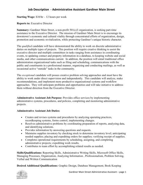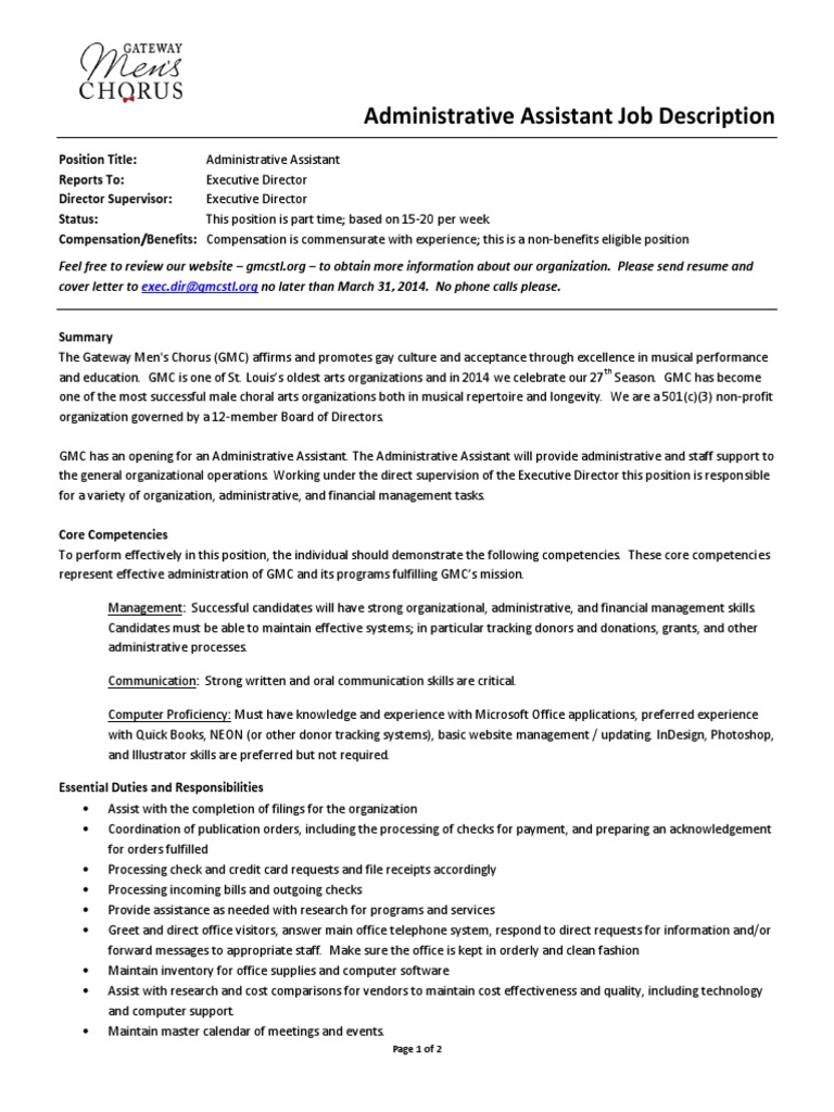 Ready to provide extraordinary customer service? Job duties for administrative assistant resume. Most administrative assistant job descriptions look. The administrative assistant is the gatekeeper to your company, so this is an extremely important hire hiring a great admin assistant or executive assistant starts with a great job description. Includes salary, duties, skills, education and how to use the job description properly for your interview. Executive assistants (and administrative assistants) often form the backbone of a company or operation. The executive assistant job description makes such a professional a combination of secretary, project manager and liaison between executive while executive assistants share certain job duties and characteristics with administrative assistants, the executive assistant's work is focused toward. The ed supervises the director of operations. For more information on what it takes to be a executive assistant, check out our complete executive assistant job description. Acting as the administrative point of contact between the executives and internal/external handling executives' requests and queries appropriately. Executive administrative assistant responsibilities include providing administrative support to ensure efficient operation of the office. This administrative assistant job description along with responsibilities and duties, key competencies, career scope administrative assistants are the key members of the administration department of an organization. At the highest end of the range, executive administrative assistants with a great deal of education.